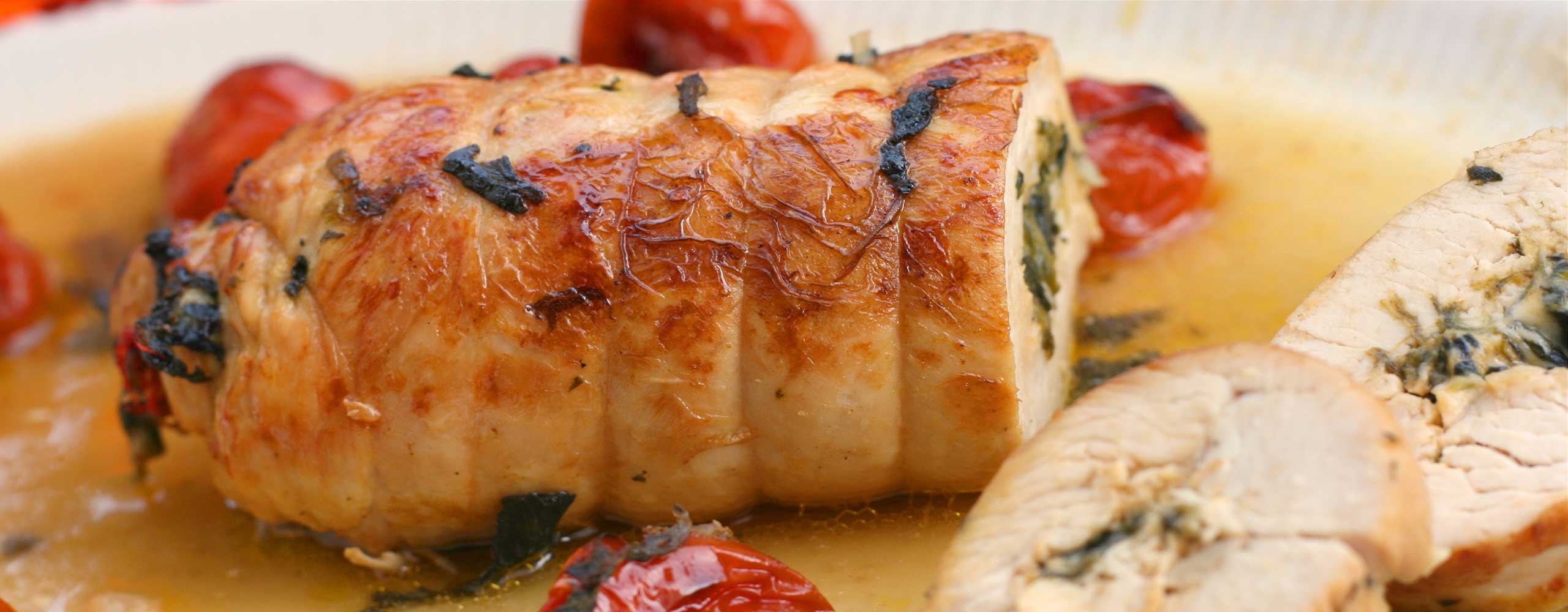 Allargate la fetta di tacchino sul piano da lavoro, salate e pepate. Distribuite sulla superficie della fetta gli spinaci e i pinoli. Arrotolate la carne e fermatela con lo spago da cucina. Disponete la rolata in una teglia, cosparsa con 30 ml d’olio, aggiungete sale e pepe.